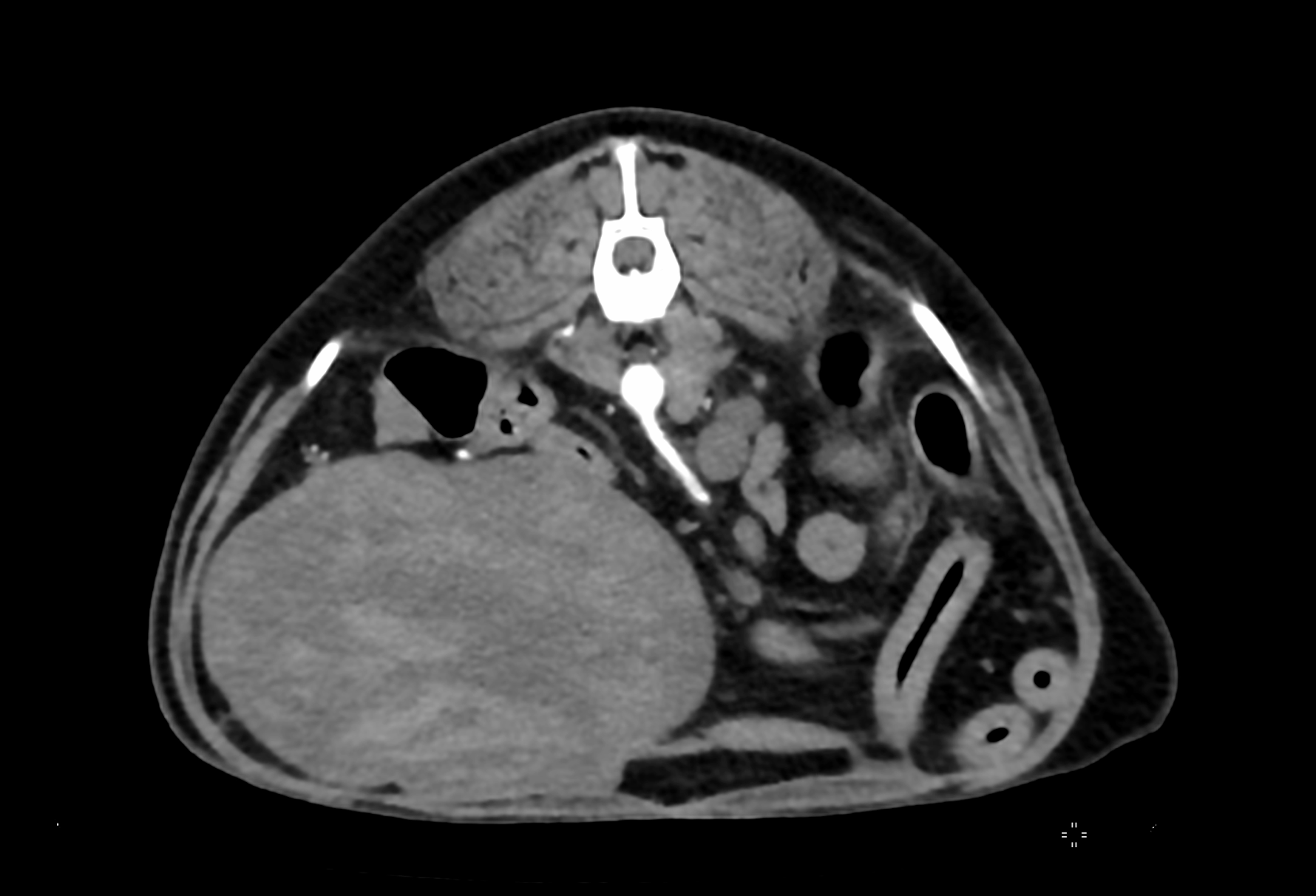 通常であれば、14歳のわんちゃんに手術を勧めることはあまりないのですが、今回の脾臓の腫瘍が破裂すると突然死を起こすこと(6~8cmもありました)、心臓の腫瘍が脾臓の腫瘍の転移ではなく別物の腫瘍であること(こちらは比較的進行がゆっくりな腫瘍と診断されました。)から、急遽CTにて全身の転移などがないことを確認し、開腹手術にて脾臓を摘出しました。